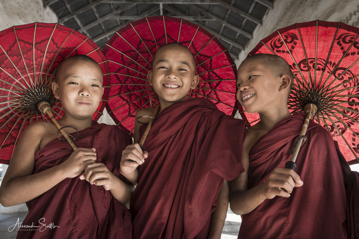 MBirmanie, trois moines se promène dans une pagode avec leur ombrelle pour se protéger des rayons du soleil, au Myanar, dans la ville de Bagan